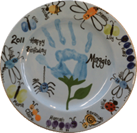 | When you celebrate your child's birthday party at Art's Afire!, you have the option to purchase a special plate to commemorate the occasion! We handle all the details during the party, including the birthday child's handprint (or other artwork) in the center and all other party attendees' fingerprints around the rim. Our Staff Artists will complete the finish-out artwork, turning it into a keepsake for you! |